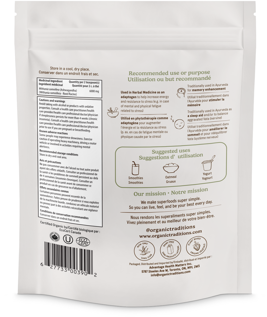 Take 1 teaspoon of Organic Traditions Ashwagandha powder as a tonic once or twice daily. Add Organic Traditions Ashwagandha powder to water, coconut water, your favorite juice or to smoothies.