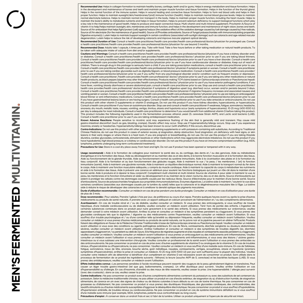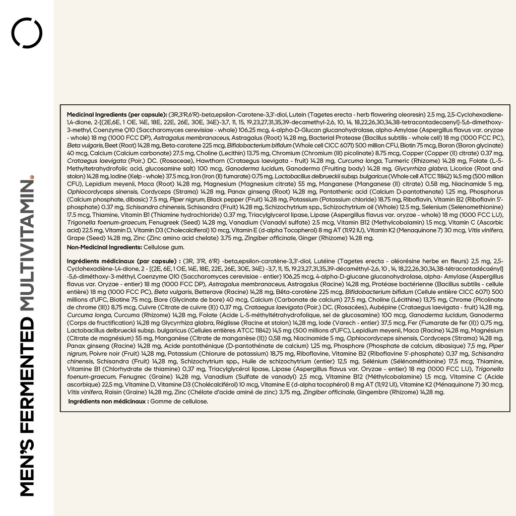 Medicinal Ingredients (per capsule): (3R,3'R,6'R)-beta,epsilon-Carotene-3,3'-diol, Lutein (Tagetes erecta - herb flowering oleoresin) 2.5 mg, 2,5-Cyclohexadiene-1,4-dione, 2-[(2E,6E, 1 OE, 14E, 18E,22E,26E,30E,34E)-3,7, 11, 15, 19,23,27,31,35,39-decamethyl-2,6, 10, 14, 18,22,26,30,34,38-tetracontadecaenyl]-5,6-dimethoxy-3-methyl, Coenzyme Q10 (Saccharomyces cerevisiae - whole) 106.25 mcg, 4-alpha-D-Glucan glucanohydrolase, alpha-Amylase (Aspergillus flavus var. oryzae - whole) 18 mg (1000 FCC DP), Astragalus membranaceus, Astragalus (Root) 14.28 mg, Bacterial Protease (Bacillus subtilis - whole cell) 18 mg (1000 FCC PC), Beta vulgaris, Beet (Root) 14.28 mg, Beta-carotene 225 mcg, Bifidobacterium bifidum (Whole cell CICC 6071) 500 million CFU, Biotin 75 mcg, Boron (Boron glycinate) 40 mcg, Calcium (Calcium carbonate) 27.5 mg, Choline (Lecithin) 13.75 mg, Chromium (Chromium (III) picolinate) 8.75 mcg, Copper (Copper (II) citrate) 0.37 mg, Crataegus laevigata (Poir.) DC. (Rosaceae), Hawthorn (Crataegus laevigata - fruit) 14.28 mg, Curcuma longa, Turmeric (Rhizome) 14.28 mg, Folate (L-5-Methyltetrahydrofolic acid, glucosamine salt) 100 mcg, Ganoderma lucidum, Ganoderma (Fruiting body) 14.28 mg, Glycyrrhiza glabra, Licorice (Root and stolon) 14.28 mg, Iodine (Kelp - whole) 37.5 mcg, Iron (Iron (II) fumarate) 0.75 mg, Lactobacillus delbrueckii subsp. bulgaricus (Whole cell ATCC 11842) 14.5 mg (500 million CFU), Lepidium meyenii, Maca (Root) 14.28 mg, Magnesium (Magnesium citrate) 55 mg, Manganese (Manganese (II) citrate) 0.58 mg, Niacinamide 5 mg, Ophiocordyceps sinensis, Cordyceps (Strama) 14.28 mg, Panax ginseng (Root) 14.28 mg, Pantothenic acid (Calcium D-pantothenate) 1.25 mg, Phosphorus (Calcium phosphate, dibasic) 7.5 mg, Piper nigrum, Black pepper (Fruit) 14.28 mg, Potassium (Potassium chloride) 18.75 mg, Riboflavin, Vitamin B2 (Riboflavin 5'-phosphate) 0.37 mg, Schisandra chinensis, Schisandra (Fruit) 14.28 mg, Schizochytrium spp., Schizochytrium oil (Whole) 12.5 mg, Selenium (Selenomethionine) 17.5 mcg, Thiamine, Vitamin B1 (Thiamine hydrochloride) 0.37 mg, Triacylglycerol lipase, Lipase (Aspergillus flavus var. oryzae - whole) 18 mg (1000 FCC LU), Trigonella foenum-graecum, Fenugreek (Seed) 14.28 mg, Vanadium (Vanadyl sulfate) 2.5 mcg, Vitamin B12 (Methylcobalamin) 1.5 mcg, Vitamin C (Ascorbic acid) 22.5 mg, Vitamin D, Vitamin D3 (Cholecalciferol) 10 mcg, Vitamin E (d-alpha Tocopherol) 8 mg AT (11.92 IU), Vitamin K2 (Menaquinone 7) 30 mcg, Vitis vinifera, Grape (Seed) 14.28 mg, Zinc (Zinc amino acid chelate) 3.75 mg, Zingiber officinale, Ginger (Rhizome) 14.28 mg. Non-Medicinal Ingredients: Methylcellulose capsule.