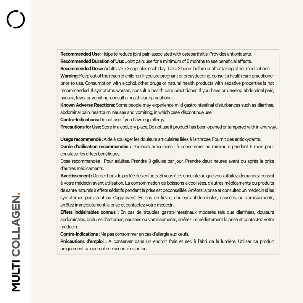 Non-Medicinal Ingredients: Hydrolyzed Bovine Collagen Peptides, Eggshell Membrane Collagen, Organic Ashwagandha Extract (root and leaf), Hydrolyzed Fish Collagen Peptides, Chicken Bone Broth Collagen Concentrate, Organic Amla Berry Extract.