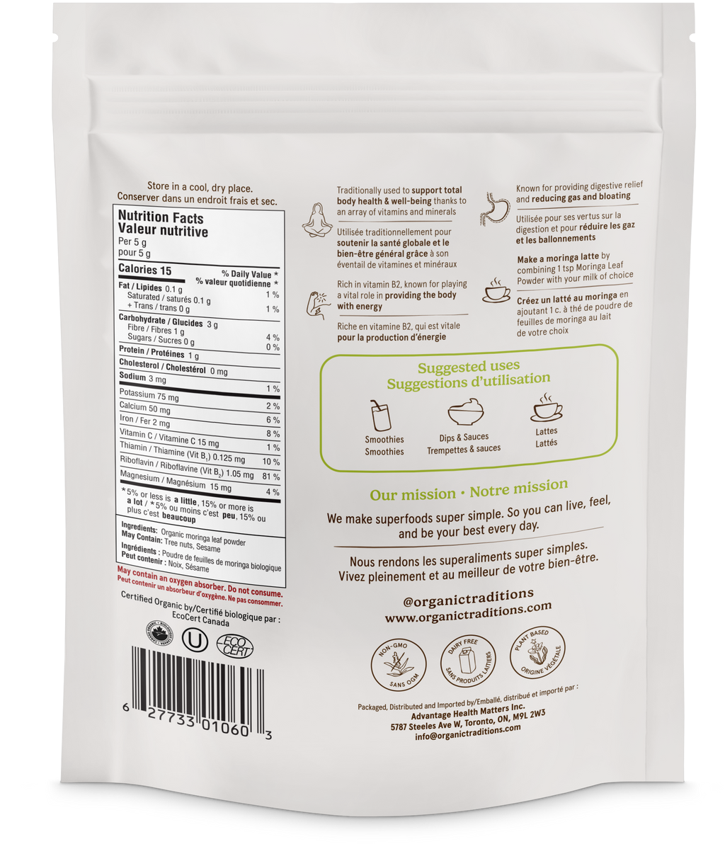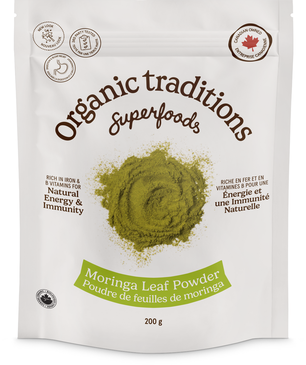 Humanitarian organizations have recognized Moringa’s unique nutritional profile and are using Moringa leaves to provide nourishment for underprivileged peoples around the world. The leaves contain an impressive array of nutrients ranging from Vitamins A, C and E to Calcium, Fiber, Selenium, Iron and a host of antioxidants. Organic Traditions Moringa leaf powder offers the most nutritious part of the Moringa plant. Fresh moringa leaves are sun dried and ground into a fine powder with no fillers flavors, sweeteners or excipients added.