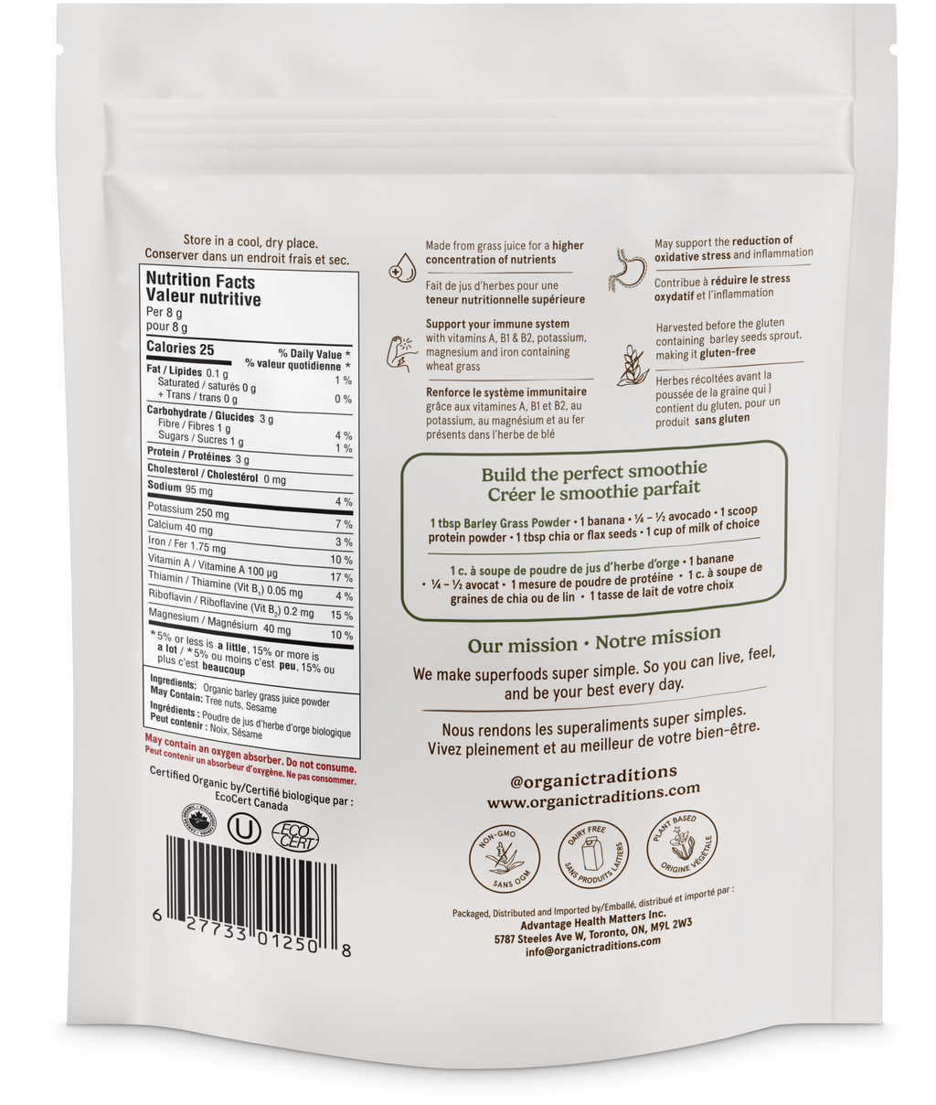 Pure organic barley grass juice powder with no additives, preservatives, or GMOs. Outdoor-grown and certified organic. Made in a facility that processes tree nuts.