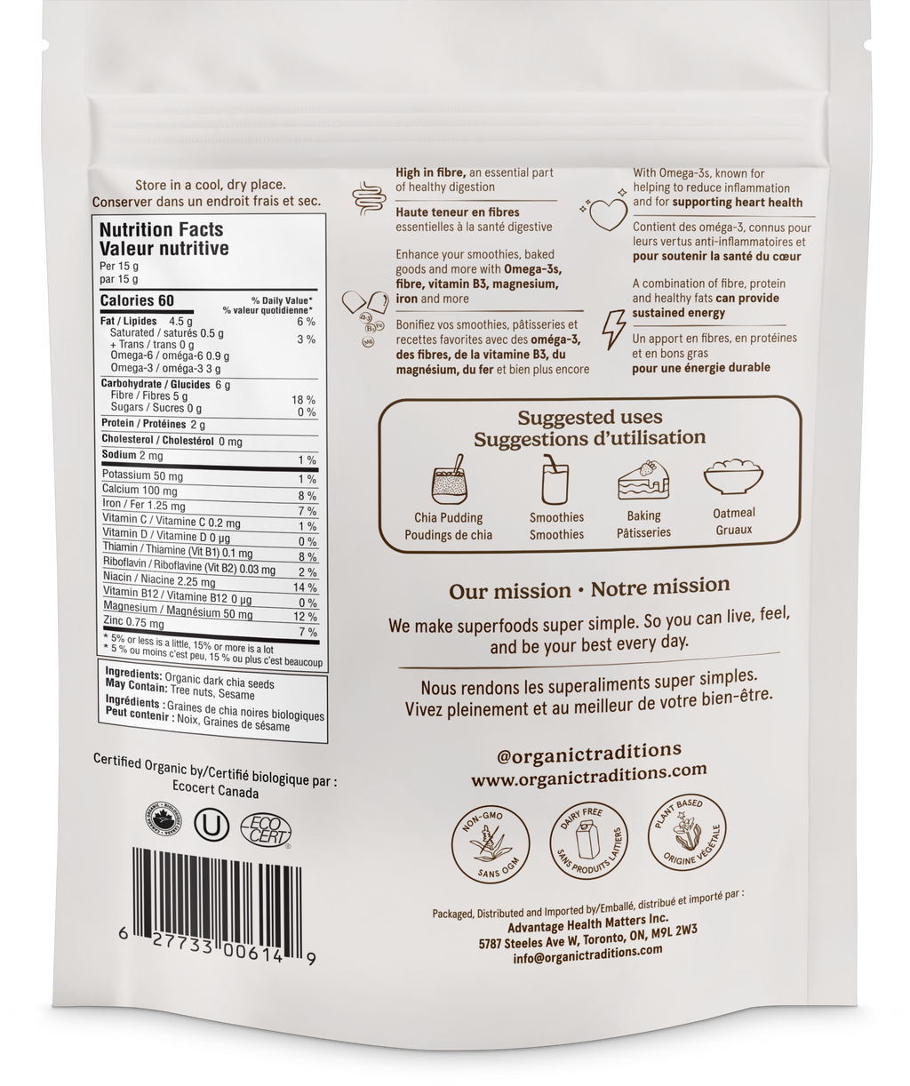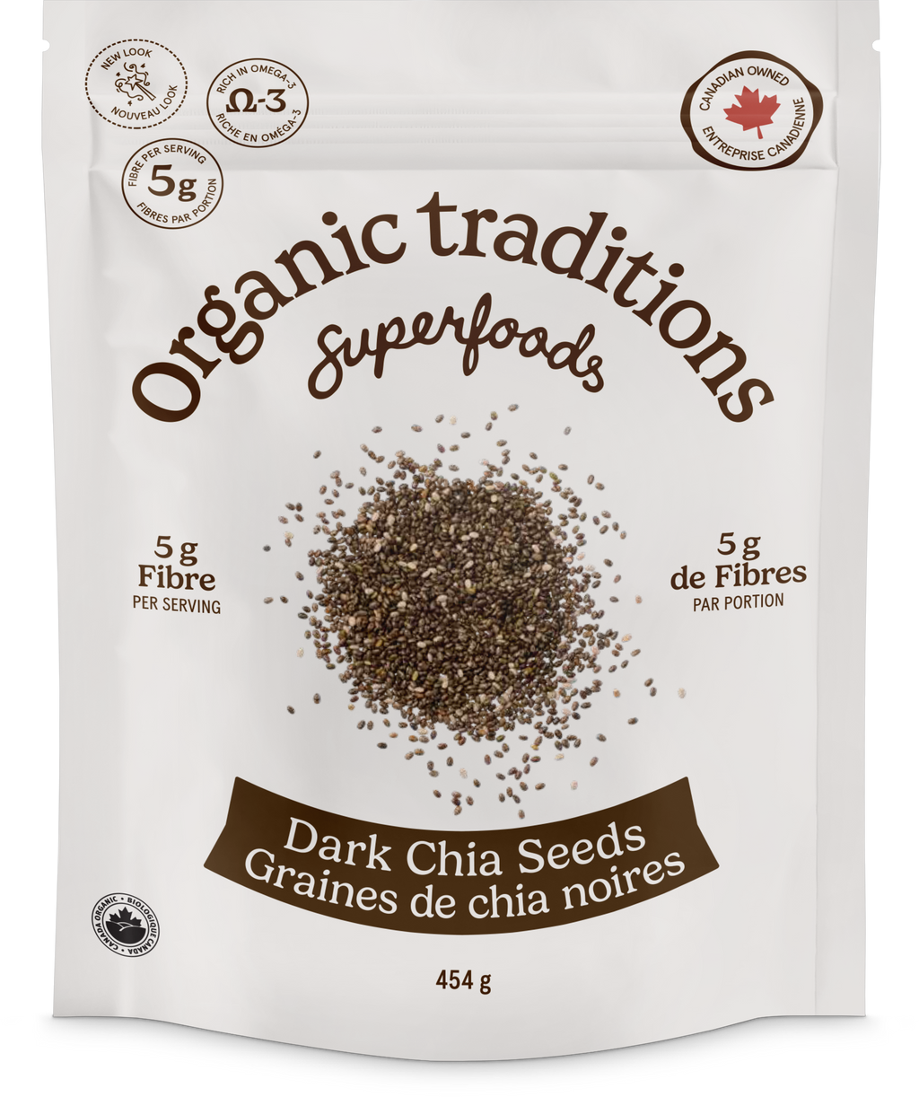 High in fiber and full of healthy omega 3 Organic Traditions Dark Chia seeds are a welcome addition to smoothies, yoghurts, water and other liquids which they help thicken.